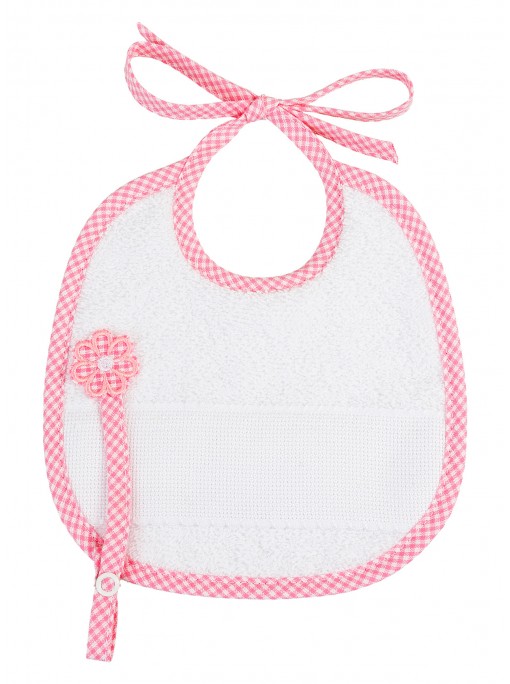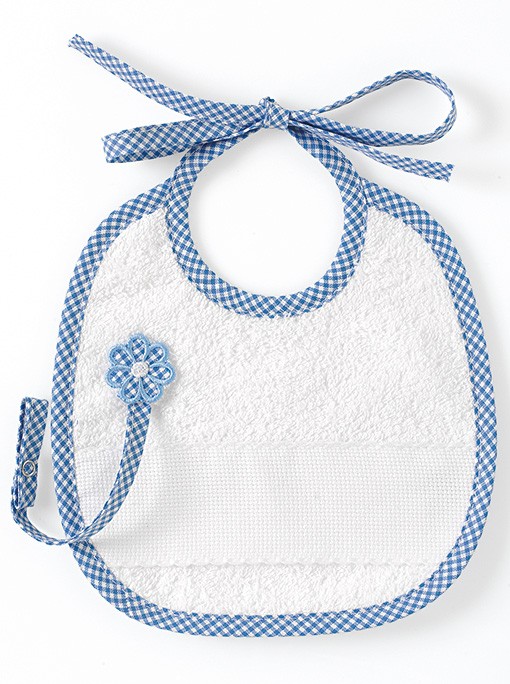 Soft double terry bib with Aida pocket. Details in satin and broderie anglaise