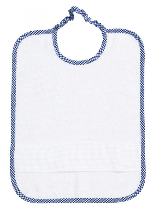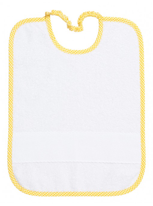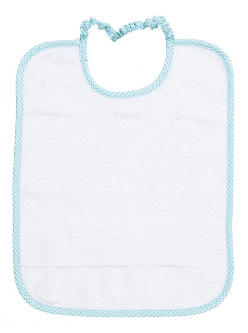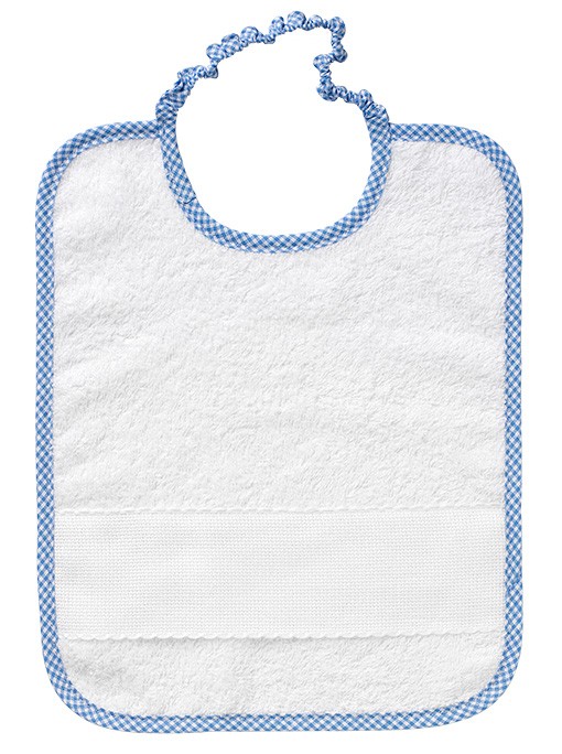 Bavaglino in morbida spugna cinigliata con tasca in tela aida da ricamare. Passamaneria in pizzo sangallo e nastro in raso colorato.