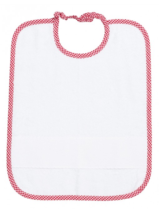 Bavaglino in spugna bianca o colorata con dettagli in pizzo sangallo e divertente taschina ad onda in tela aida bianca.