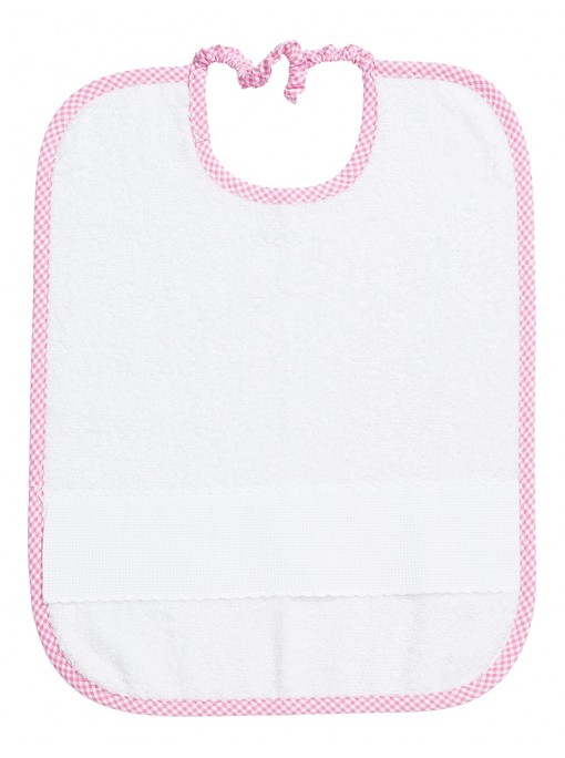Bavaglino in morbido tessuto con taschina in tela aida da ricamare, separata dal retro del bavaglino da uno sbieco bianco e da una crocchetta (cucitura a zig zag), in tinta con lo sbieco.Chiusura con laccetti in cotone bianco.