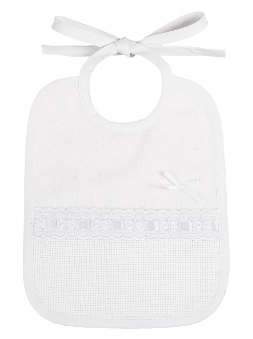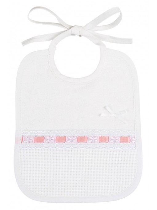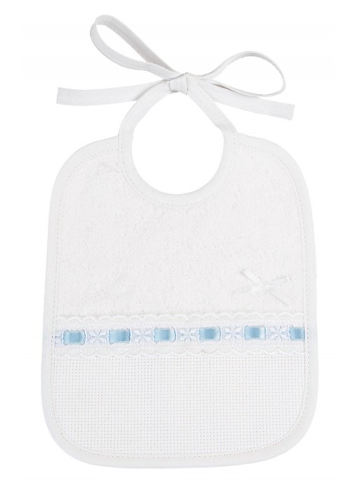 Bavaglino in morbida spugna cinigliata con tasca in tela aida da ricamare. Passamaneria in pizzo sangallo e nastro in raso colorato.